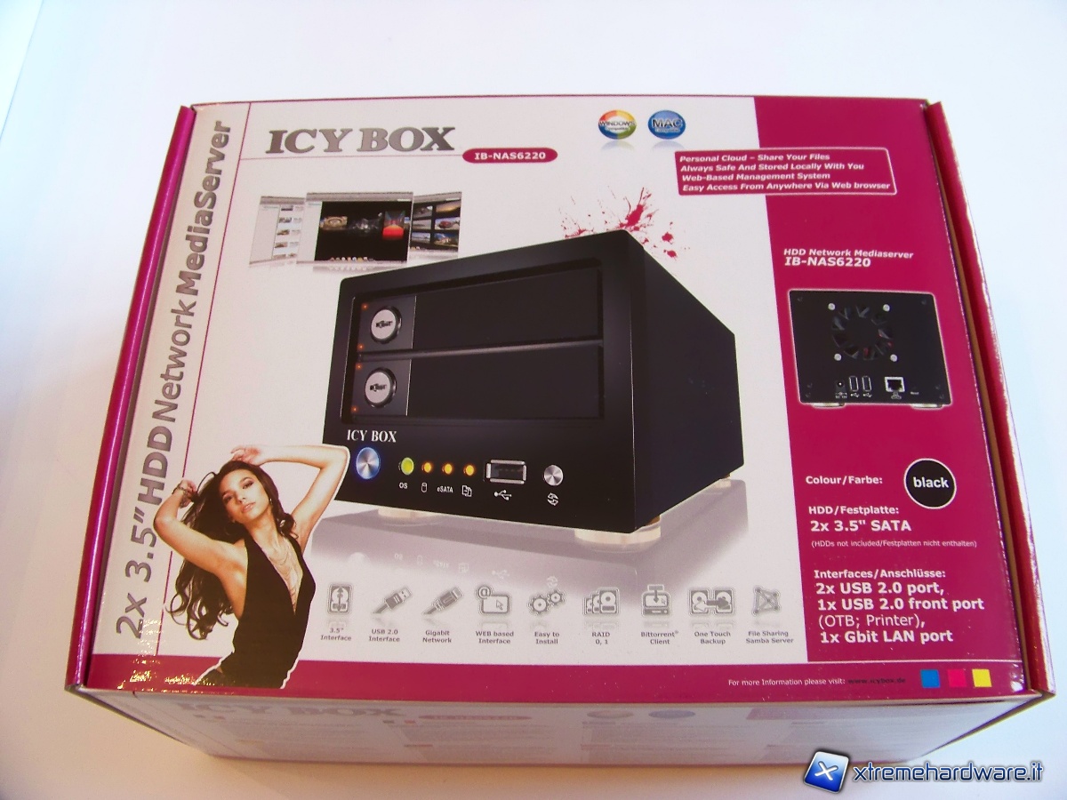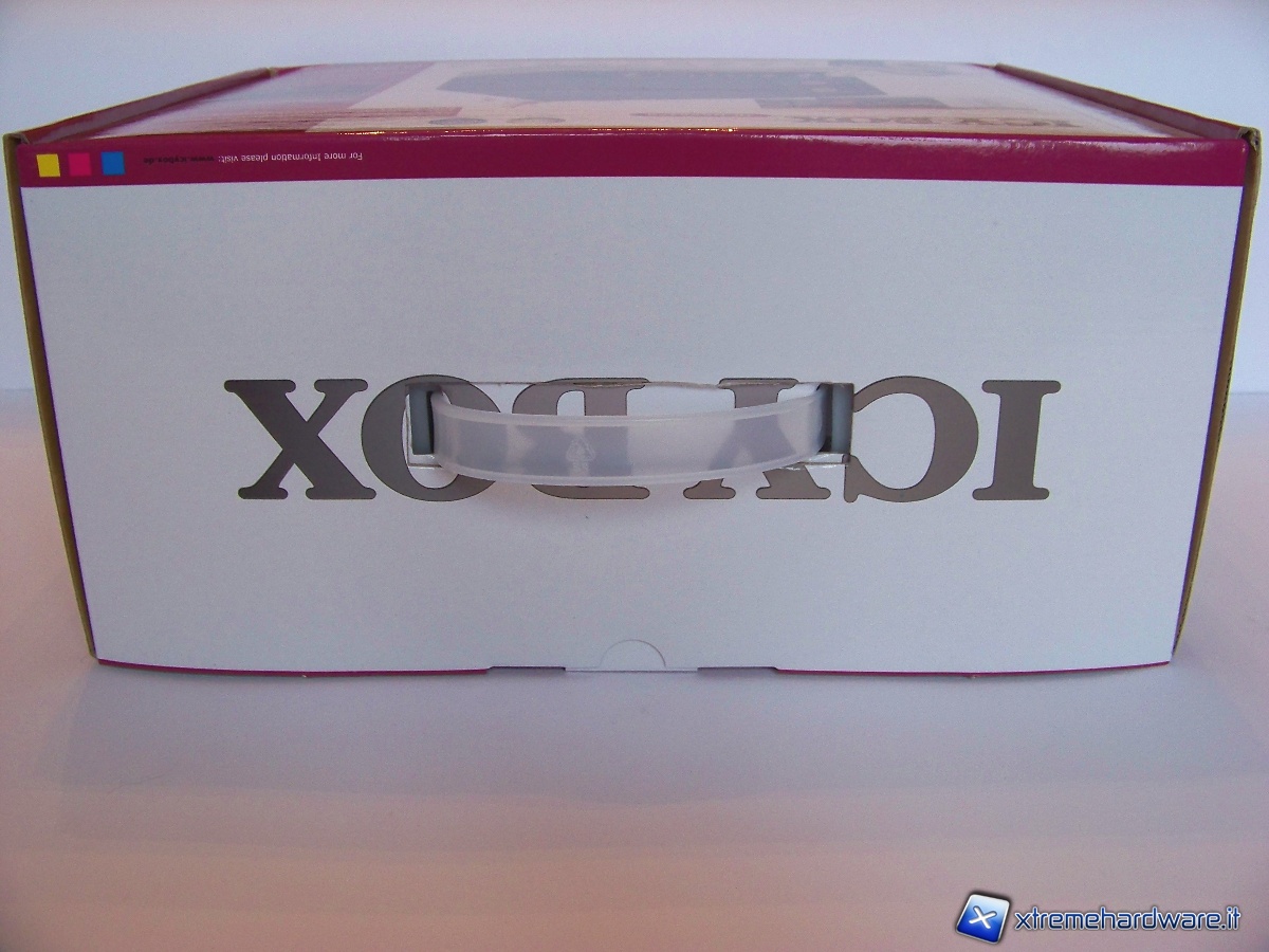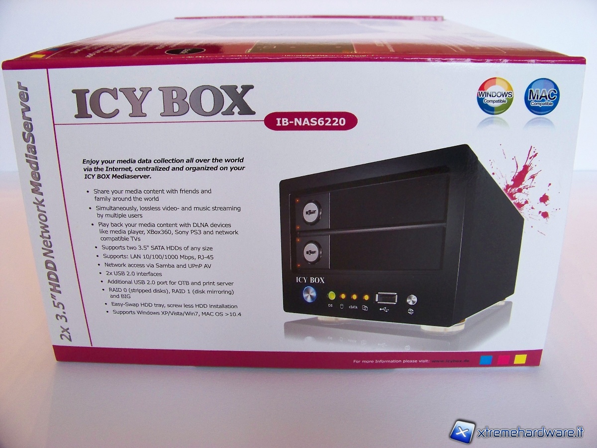 La scatola mantiene le caratteristiche che contraddistinguono i prodotti RaidSonic; colori sgargianti e ricchezza di informazioni. La parte superiore permette velocemente di renderci conto del prodotto che stiamo per acquistare, infatti troviamo informazioni inerenti al prodotto quali: colore, collegamenti, servizi, slot a disposizione e compatibilità con sistemi operativi Microsoft e Apple. Tali informazioni sono contornate da un’immagine centrale riportante la foto del prodotto.