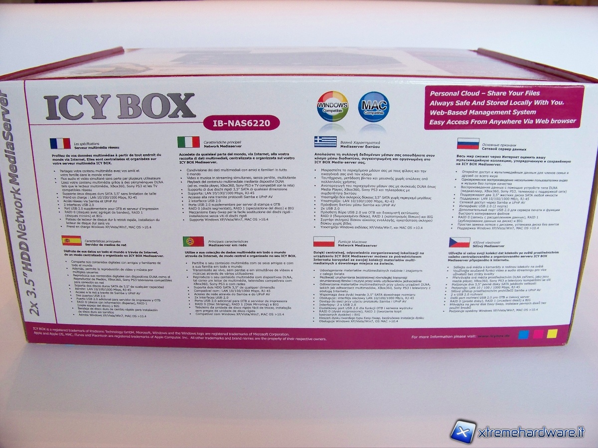 La parte posteriore della scatola presenta informazioni relative alle feature principali del prodotto e uno schema di utilizzo ottimale dell’IB-NAS6220, collegato a numerosi apparecchi multimediali. Inoltre troviamo, scritti in inglese, i requisiti minimi per poter utilizzare tale prodotto.