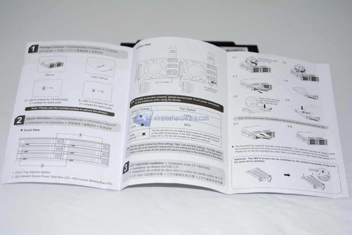 All’interno della confezione troviamo il prodotto ed un manuale rapido e ben spiegato che ci mostra l’installazione del prodotto e dei dischi al suo interno.