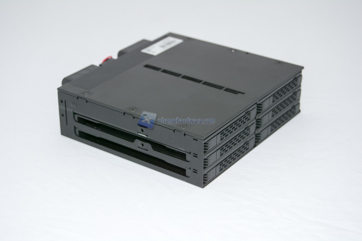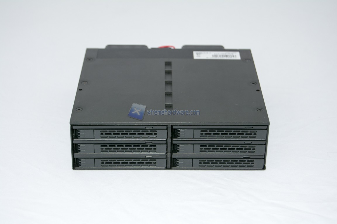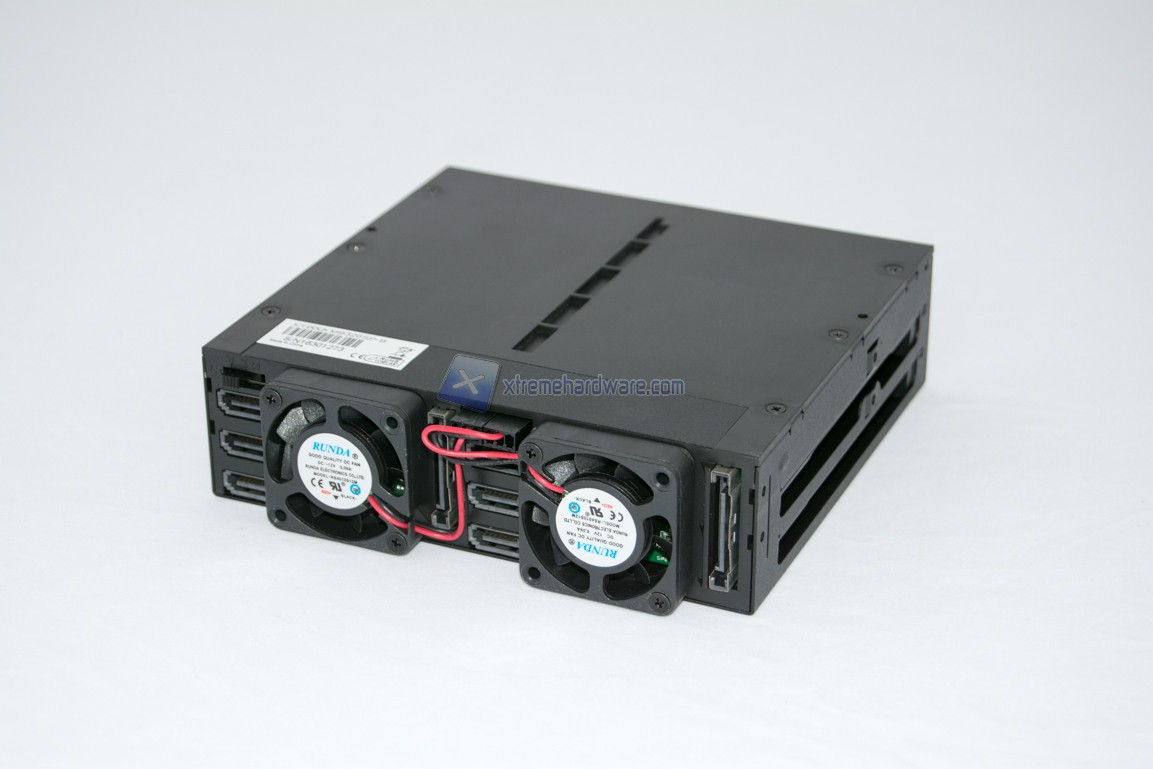 Il retro, invece, presenta i collegamenti SATA/SAS dei sei dischi, due connettori per alimentare i dischi (2x3 dischi rispettivamente), due piccole ventole in estrazione e uno switch per regolare le ventole stesse.